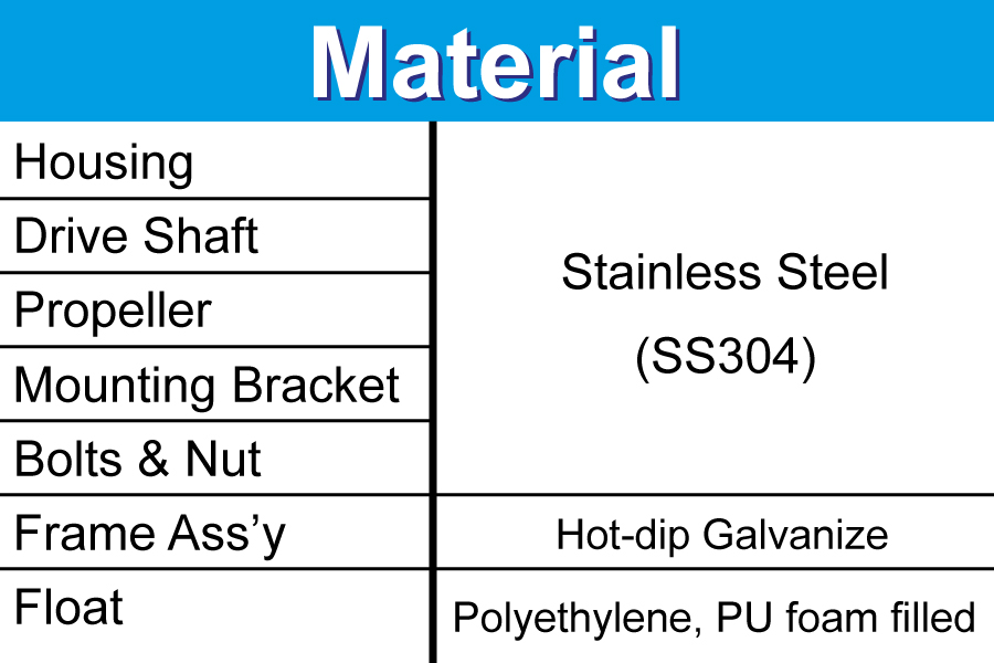 ผลิตภัณฑ์เครื่องเติมอากาศในน้ำ ผลิตจากสแตนเลส 304/316 ขึ้นอยู่กับความเร็วคุณภาพน้ำที่ 1,500 รอบต่อนาที และ 3,000 รอบต่อนาที